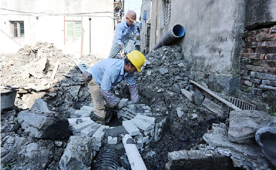 一点一点、一滴一滴……汗水从管道工人的额头滑落,他们面前是正在施工的砖砌井和接户管工程。