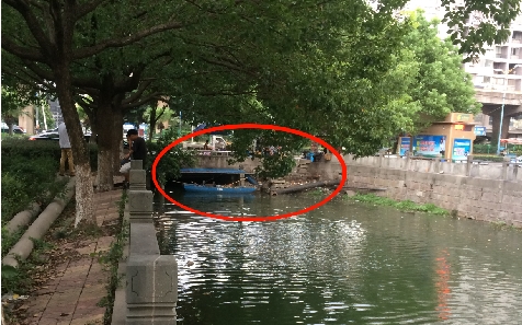 在卢先生的指引下,记者来到位于商城北侧的河边,河流为东西流向。“你看那个桥下,有一半的宽度被堵了,有次暴雨我就来河边看看到底是什么原因,一看,桥下堆了好多杂物,都是被冲过来的,河水很难流过去。”记者看到,河流的宽度目测约10米,但是到了东面的桥下,宽度突然变窄为原先的一半,有一半被石头、管子等堵住,另一半可供河水流过的宽度则停了一艘小船,据悉,这条小船是清理河面用的。