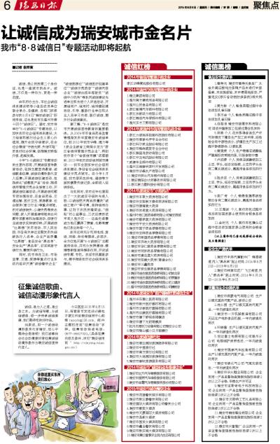 据了解,“8·8诚信日”是我市开展诚信宣传教育的重要载体。从2009年市食品药品监督管理局发布年度瑞安市诚信单位,到2012年我市华峰、通力等3家企业被省工商局认定为“浙江省信用管理示范企业”,再到我市首个“省级信用镇”花落湖岭、2013年我市启动信用城市建设……我市全面加快社会信用体系建设,争创省社会信用体系建设示范点城市。自今年5月起,我市居民在供电、通信等方面的缴费失信记录,全部纳入征信系统。