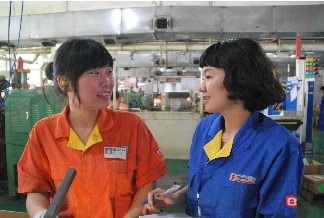 当天早上10时许,张隔忙完手头上的工作之后,走进成品仓库,找职工何盈颖谈心。何盈颖今年刚从大学物流管理专业毕业,7月16日应聘成为长城换向器成品仓库一名记账员。入职后,张隔与何盈颖结对,成为她的职业顾问。
