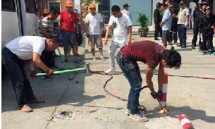 8月4日上午9时许,上望街道望东西路拉起了一圈警戒线,数名城管行政执法人员在现场维持秩序,拆违人员将地面上的一根根违章车桩“拔”掉。当天上午,市城建监察大队执法室、城建监察上望中队组织拆违人员100多人次,拆除违章墙体广告300多平方和7处路面违章车桩。