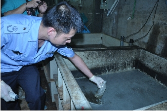 执法人员立即对水槽周边的废水进行取样,同时查封违法排污的生产设备,并对多位工人进行询问取证。