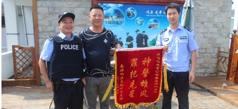 昨日上午,南滨街道大桥村村“两委”成员带着一面上书“神警雄风,罪犯克星”的锦旗,来到南滨派出所,感谢该所办案民警陈警官为该村9旬老人追回被盗血汗钱(如下图)。