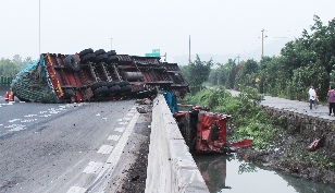 本报讯(通讯员 汤琴思 记者 陈瑞建)昨日凌晨2时53分,温州高速交警二大队接到指挥中心指令,称G15沈海高速福建方向距瑞安出口500米处,一辆半挂车侧翻,车头翻出护栏。