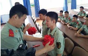 又到部队老兵退伍的日子,离别时难舍战友情。日前,市公安消防局全体官兵整齐列队,在营门一侧欢送战友,两名退伍消防老兵与战友们一一拥抱告别,依依不舍踏上回家路。图为留队战士为退伍老兵佩戴红花。 (记者 金邦寅)