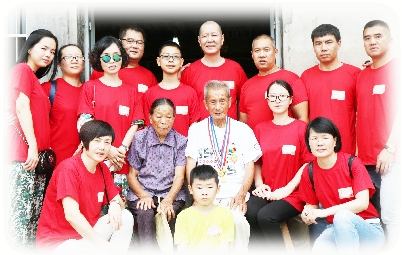 为了对金老表示尊敬,我们统一穿上红色圆领衫,并在胸前贴上印有“一寸山河一寸土向抗战老兵致敬”的号牌。