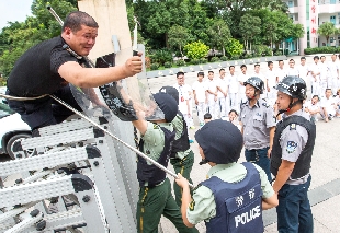 9月9日,飞云江边防派出所官兵在新纪元学校开展反恐防暴应急处置演练活动。反恐防暴演练主要模拟一名不明身份的暴徒持刀闯入校园,学校及时启动反恐防暴应急机制,报警后及时召集学校安保力量利用警棍、钢叉、盾牌等安保器材,成功制服了这名暴徒。同时,校方及时疏散校园师生,将师生撤离到了安全地方。此外,公安边防官兵向师生细致讲解了校园安全防范器材的运用及相关安全防范知识,提高师生安全防范能力。