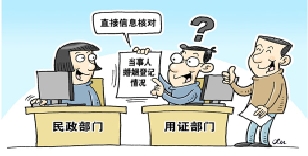 如果相关部门根据法律法规依据、需要了解核对当事人婚姻登记情况的,可以通过开放信息核对端口、登记查询等多种方式,在部门间直接完成信息核对工作,不再需要当事人在婚姻登记信息使用部门和民政部门之间往返奔波。