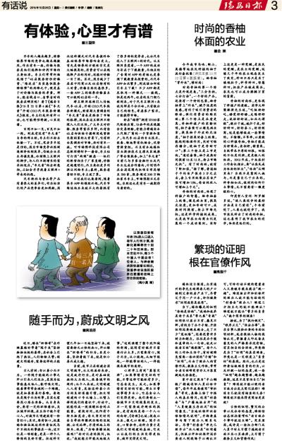 香柚的时尚性,更体现了种植户的虔敬。国学大师梁漱溟先生说,“吃饭好好吃,睡觉好好睡,走路好好走,说话好好说,如此之谓敬”,敬出于诚,诚归于成,好好种田,好好务工,好好经商,这是能够做成一些事情的。不偷懒,不草率,以虔敬的心种植香柚,香柚才能成为好商品,卖相好,销量高,自然带来丰厚的回报。回报的不仅是利润,更是做人的体面。2013年底,中央农村工作会议指出,要“让农民成为体面的职业”。“体面”从哪里来?当然不是靠别人施与,而是靠自己干出来的。种香柚如此,做别的任何什么事情,无不需要有一颗虔敬的心。
