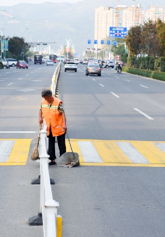 昨天是环卫工人节,我市1000余名环卫工人跟往常一样坚守岗位,他们穿着橘黄色的工作服,骑着清洁车往返于大街小巷,把地面上的垃圾清扫干净,保持街道清洁卫生。图为环卫工人田大妈在罗阳大道上打扫卫生。 (记者 陈立波)