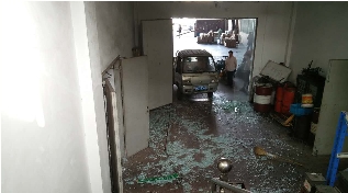余先生说,车子撞上了玻璃门之后,玻璃门并没碎,只是裂了,跟蜘蛛网似的,然后大家就想把玻璃门移开,哪知道大家稍一用力,整扇玻璃门就碎了,玻璃渣刮伤了站在旁边观看的一名工人头部,幸亏并无大碍。