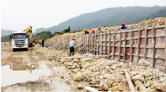 天长村段防洪堤建于2006年,防洪标准为10年一遇。由于防洪标准低,前年“菲特”台风引发的山洪将这里一整段370多米长的防洪堤冲毁。去年湖岭镇启动修复工程,力保该防洪堤不再受损。但今年汛期,该防洪堤受到第13号“苏迪罗”台风带来的强降雨影响,再次受损。为了尽早启动修复工程,水利部门及当地镇政府共同努力,汛期期间就完成了该修复工程设计及施工招投标等工作。汛期一结束,水利部门立即督促施工单位进场施工,并落实修复资金。据施工单位项目经理介绍,预计工程于2016年3月完工。