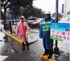 记者看到,莘阳大道与万松东路交叉口车流量大,机动车、电瓶车、自行车、行人交织,10多名交通劝导志愿者身披雨衣,手持“大拇指”、小黄旗,协助交警维护交通秩序。