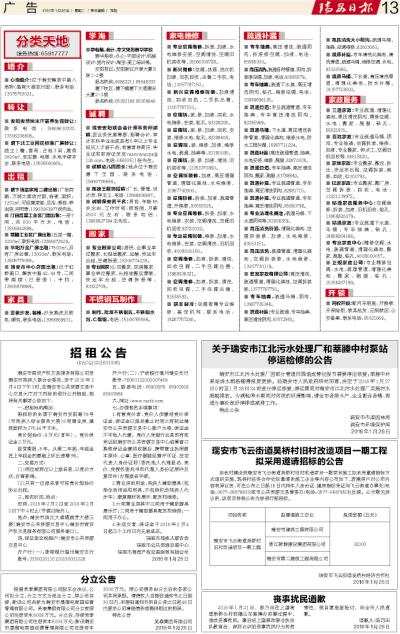 ■ 瑞安安阳联合会计师事务所诚聘:因业务发展需要,招聘会计、审计本科毕业生或具有5年以上专业经历人才若干名,有意者将简历、毕业证和职称证发至raanyangcpa@126.com,电话:65653511张先生。