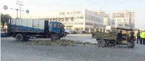 本报讯(通讯员 曾大威 记者 孙文静)前日上午6时许,开发区大道八十亩路口发生一幕险情:一辆满载砖块的低速货车经过路口时,被左侧的一辆大货车撞击车头位置,车上的砖块如瀑布一样倾泻而下,散落一地,驾驶员漆某的腿部也受了伤。
