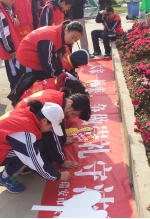 本报讯(记者 欧苗苗 )日前,在瑞安新湖郁金香公园里,来自安阳实验中学七年级四班的19位学生和19位家长拉起了以“大家一起来,争做崇礼守法瑞安人”的横幅,并在横幅上签名争做文明瑞安人。