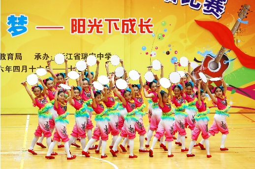 4月17日,我市中小学生在瑞安中学体育馆里进行精彩的群舞表演。当天,我市为期半个月的2016年中小学艺术节活动落下帷幕。这次艺术节以“民族魂·中国梦——阳光下成长” 为主题,开展了声乐、舞蹈、器乐、戏剧、朗诵、微电影、绘画、书法、篆刻、摄影、剪纸、设计、立体造型等13个项目比赛,以此弘扬中华民族优秀文化,展现学生艺术风采。 (记者 庄颖昶)