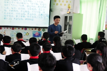 “仲尼居,曾子侍。子曰:‘先王有至德要道,以顺天下,民用和睦,上下无怨,汝知之乎?’……”4月13日13时30分,鲍田中心小学六(1)班教室传来整齐的诵读声,语文老师郑一占正在给该班学生上《孝经》诵读课。