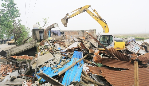 镜头二:莘塍街道农办、联合执法中心等单位联合环保、电力、土地、住建等部门,开展联合执法,一台挖掘机挥舞长臂,拆除一座紧邻周田沥的老旧的养殖场。