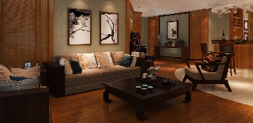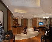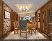 入户后配合整体玄关布局,创意设计师大胆地呼应天棚造型将玄关与客厅的地面材料区分,弧度的线条下地板与地砖“动感”化拼接,且毫无“违和感”,相反演绎出一种时尚的东方式混搭韵味,使得风格美感变得别具一格。吧台、门窗与部分墙体以木饰纹理打造出浓郁的异域风尚,呼应出新中式的宁静与雅致;餐厅的“文化石”背景墙搭配家具与挂画体现出质朴的自然气息,点燃起业主对于生活格调的追求与憧憬。