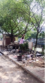 部分村民在城北村西直河周边违章搭建简易棚,作为自家仓库,简易棚周边垃圾随意堆放,存在“脏乱差”现象。我市“创卫”期间,锦湖街道加大力度整治城中村乱象,强制拆除河岸边的违章简易棚,清扫环境。当天共清理垃圾5卡车,拆除违章建筑面积约500平方米。