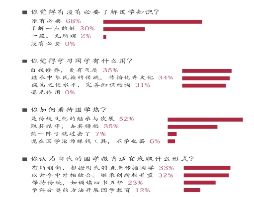 学生是否应该学习国学?55%的人认为是当务之急,43%的人认为要适当了解,而只有2%的人认为没多大必要。学习国学应该从什么时候开始学比较好?73%说“从小启蒙,还是童子功比较重要 ”,26%的人说“凭个人兴趣,自愿学习”,也有1%的人认为“小时候不懂,最好长大后再学”。