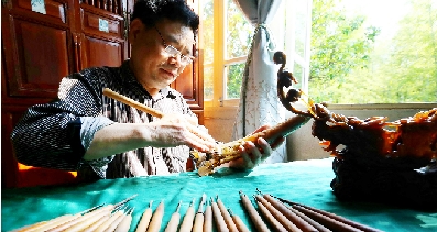 6月11日是第11个中国文化遗产日。昨日,记者在湖岭镇下街村民间艺人陈光宇家中,看到了各式各样的牛角雕刻作品,个个作品神形兼备,有薄至透明的蝉翼、灵动鲜活的对虾、展翅欲飞的仙鹤、神态威武的蛟龙、嗷嗷待哺的小鸟、飘逸忧郁的嫦娥……牛角雕刻是温州市级非物质文化遗产项目,今天让我们一起来领略一下吧!