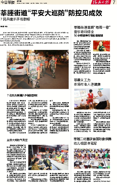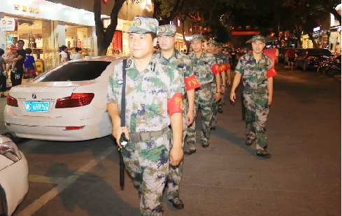 6月14日19时,莘塍街道张永新、叶成锡、陈波、李云丰、吴普博、夏碎娒、姜达锋等7名民兵身穿迷彩服、腰里别着警棍,手臂戴上印有“平安巡防”字样的红袖箍,在镇府路、民莘路、莘塍东街等繁华地带巡逻。今年5月份以来,莘塍街道组织开展5次民兵巡防,上述7人没有落下一次。