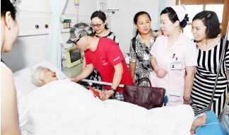 本报讯(记者 陈立波)7月8日上午,温州关爱抗战老兵瑞安志愿队的爱心人士来到市人民医院,看望正在接受治疗的老兵庄雪琴。他们与庄雪琴亲切交流,鼓励她积极治疗,并送上了爱心款5000元。