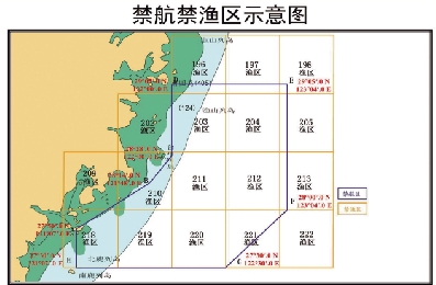 包括196、197、198、202、203、204、205、209、210、211、212、213、218、219、220、221、222共17个渔区。实际使用武器演练期间,北上和南下的船只从123°04′00〞E线以东海域航行,并听从外围警戒舰艇的指挥,以策安全。