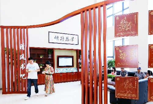 本报讯(记者 林翔翔/文 庄颖昶/图)日前,市纪委派驻第十纪检组在气象防汛大楼建设的廉政文化阵地全部完工。阵地共有四大板块,分别为廉政文化墙、廉政文化大厅、廉政文化电梯、廉政文化走廊等,气象防汛大楼大厅右侧的清风书吧(如图)是廉政文化大厅中的一块内容,农口单位机关工作人员午休时间在那聊天、看书、了解“清官廉吏”故事……