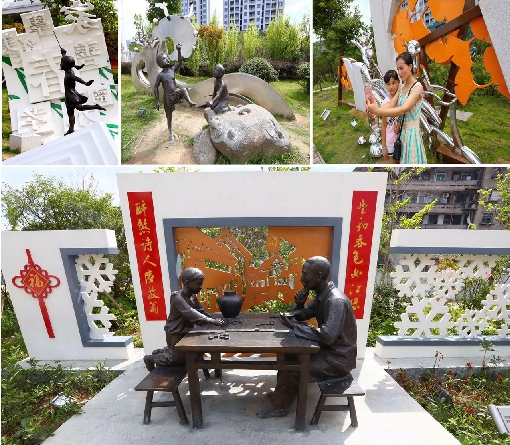 近日,《春水舞韵》、《夏日童嬉》、《秋叶浓情》和《冬酿雅蕴》4个组合雕塑亮相滨江三期堤坝上,吸引着过往行人的眼球。这组春夏秋冬雕塑包含了丰和春老酒汗、东源木活字、飞云江和瑞安县主簿第一人陆游等瑞安元素,不但可以观赏,还可触摸。该组雕塑的设置,提升了滨江三期景观公园文化艺术气息和品质。
