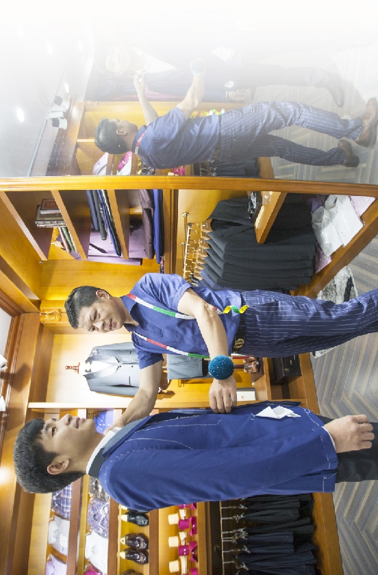 在瑞安,有不少量体裁衣的私人定制店。近日,记者探访了一家位于外滩的新潮西装私人定制店。店主李良武今年40多岁,从事西装行业15年,熟知西装工艺、设计等工序,去年他从原来的工业化生产西装转型发展为个性定制西装。“大工厂生产的西服虽好,但是标准化生产,适应社会大众群体,个别人士体型很难买到合体的西服。而且市场上普通西服以黑色、深蓝色为主,颜色和款式都较单一。”李良武说,他因此萌生开一家西装定制店的念头。