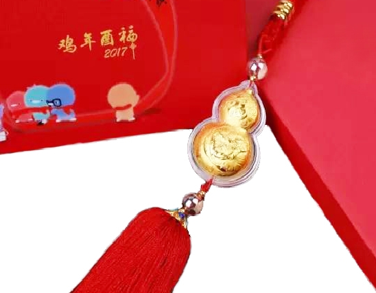 农行2017年“鸡年酉福”金葫芦采用黄金超薄压制技术,立体塑形,工艺精湛,以传统葫芦造型配以大红流苏,引入“平安福”、“牡丹”等传统元素,寓意吉祥富贵,万事如意。“葫芦”与 “福禄”谐音,民间常用葫芦来表示福禄,枝叶繁茂、多果的藤蔓与多籽的葫芦表示 “子孙万代,繁茂吉祥”。而在中华吉祥文化中,牡丹以其雍容典雅、美丽大方的形象代表着富贵、祥和、圆满。