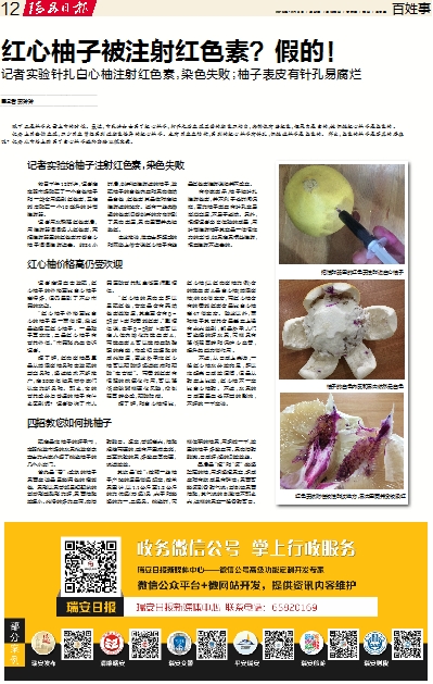 记者实验针扎白心柚注射红色素,染色失败;柚子表皮有针孔易腐烂
