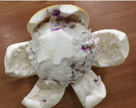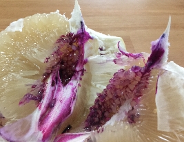 记者用水稀释红色素后,用注射器慢慢吸入红色素,再把注射器里的红色素对着白心柚子慢慢注射进去。约24小时后,剖开被注射过的柚子,发现柚子的白色内皮和果肉依然是白色,红色素只是依附在被注射过的地方。还有一些未渗透的色素顺着剖开的方向流到了果肉表层,果肉里面并未被染红。