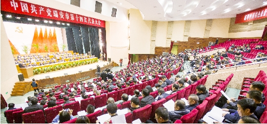 市政会议中心大会堂内布置一新,显得格外庄严、隆重。大会会场主席台正上方悬挂着“中国共产党瑞安市第十四次代表大会”的巨幅会标,十面鲜艳的红旗簇拥着由镰刀和锤子组成的金色党徽。大会的主要任务是:高举中国特色社会主义伟大旗帜,以邓小平理论、“三个代表”重要思想、科学发展观为指导,深入学习贯彻习近平总书记系列重要讲话精神,认真总结市第十三次党代会以来的工作,研究谋划今后五年的奋斗目标和主要任务,动员全市广大党员和干部群众适应新常态,践行新理念,开启新征程,再谱瑞安融合发展、赶超发展的新篇章。