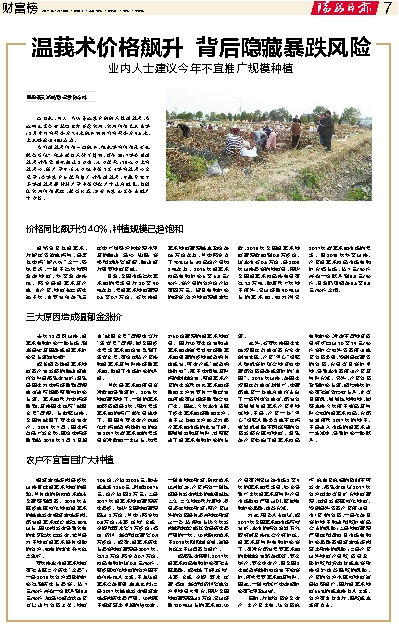 当前温莪术价格一路飙升,但来年的价格是否也保持高位?记者近日采访了解到,预计2017年全国温莪术种植总面积超过2万亩,足以提取130吨以上的莪术油,该产量可满足以往市场3至4年的莪术油需求量;今年农户如规模推广种植温莪术,可能导致下半年温莪术原材料产量市场供给严重过剩现象,将促使收购价格暴跌,效益大减,部分药农甚至会出现严重亏损。