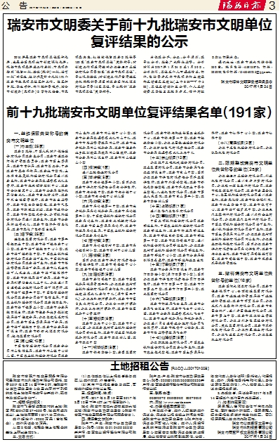 2016年是瑞安市文明单位复评之年,也是全国文明城市创建深化之年。根据市文明委年度工作安排,市文明办按照“保留一批、整改(撤销)一批、培育一批”的思路,组织开展前十九批191个瑞安市级文明单位复评工作。经复评申报、实地考评、部门联评等程序,结合市创建办(文明办)日常情况检查,市文明委决定,拟继续保留瑞安日报社等150家“瑞安市文明单位”荣誉称号;对创建工作明显滑坡的浙江金石刀具股份有限公司等25家“瑞安市文明单位”,予以限期整改;对创建工作严重滑坡或者机构撤销等原因的瑞安国际大酒店有限公司等16家单位,予以撤销“瑞安市文明单位”荣誉称号。
