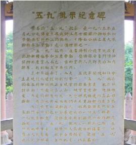 市区隆山公园内有一个小亭子,亭内立着一块汉白玉石纪念碑,碑上密密麻麻的碑文刻的是毛泽东在1963年5月9日审阅《浙江省七个关于干部参加劳动的好材料》后作出的重要批语,即被广大干部群众称为群众路线教育经典教科书的“五·九”批示。
