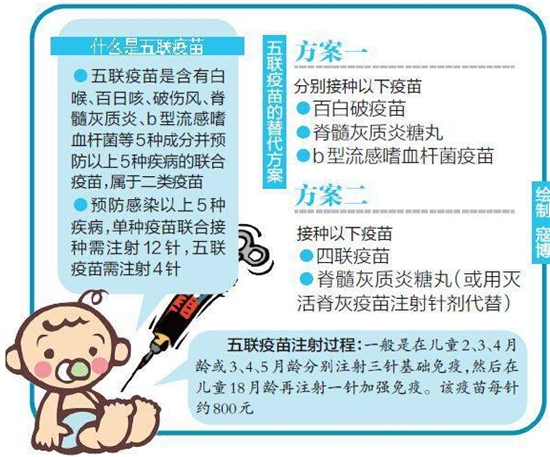 与传统的接种方式相比,至少可以让孩子少打8针,也相应减少人力和时间成本,因此受到不少家长青睐。按照五联疫苗的接种时间,儿童在2、3、4月龄或3、4、5月龄分别进行三针基础免疫,然后在18月龄再注射一针加强免疫。