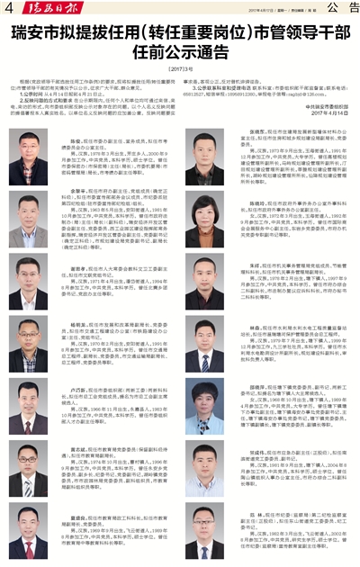 瑞安市拟提拔任用(转任重要岗位)市管领导干部