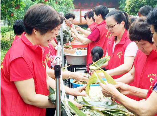 端午节将至,粽子早已满街飘香。昨日,风荷社区志愿者们将提早准备好的粽叶、糯米、蜜饯一字排开,递粽叶的递粽叶,包粽子的包粽子,气氛十分融洽(如右图)。 活动结束后,社区工作人员将粽子、八宝粥等礼品,送给困难党员、辖区新居民、低保户等。