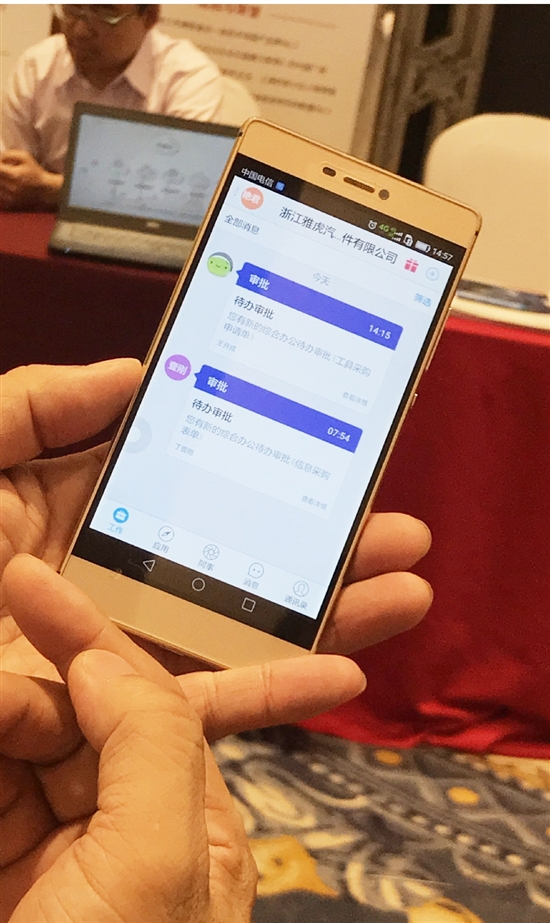 “自从‘上云’后,给我们的工作带来了便捷和效率。以审批为例,以前,员工上报审批可谓是‘层层障碍’,而现在,他们只需使用自己的账号登陆云端办公系统,通过系统将审批内容发送给我,我在云端上进行批复即可,随时随地都可进行,就算出差依然不耽误审批工作。我相信,‘上云’是企业发展的大势所趋,也是信息化的必经之路。”现场,该负责人还通过手机给我们演示了审批回复过程。