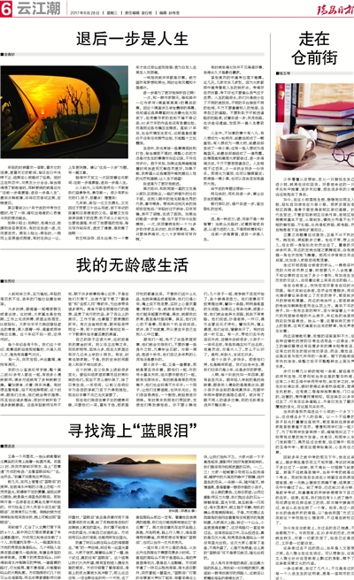 某次培训,和我同居一屋的文友是从部队正团转业,一路打拼晋升的处级干部。在别人眼中的她无疑是优秀的代表,著作等身。哪知年近知天命的她却悠悠地说:“年轻时过于拼命,日夜写稿,弄坏了颈椎,住进了医院。如果当时能退一步缓一缓,也不至于如今这般模样。一次,我顶着病体和一个70多岁的作家去采访时,我好羡慕他。瞧,只要保养得好,七八十岁照样可写作啊。”
