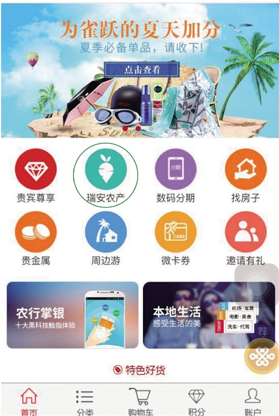 瑞安农行“微商城”是温州农行自建区域性电商平台,主打“温州专供”品牌特色,融合“积分购”、“特惠购”、“增值服务”等功能,其覆盖了800多万温州农行客户,所售商品不赚利差,积分可抵现。既为温州本地名特优商品提供销售、宣传渠道,也为农行客户在线购买家乡商品提供优惠。