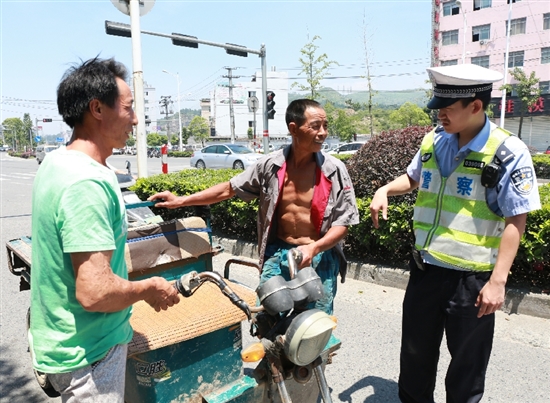 “停车,请接受检查。”104国道华表路口,交警莘塍中队副中队长陈文波顾不上擦一把汗,打着手势引导一辆正三轮摩托车靠边停车检查,并劝告驾驶员正三轮摩托车不能违法载人、超载。
