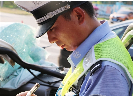 执勤点道路宽阔、车辆川流不息,周围没有可以遮阳的地方,烈日下,袁峰和郑建军仍镇定地处理事故、疏导交通。整整一上午,他们的警服一直被汗水浸泡着。