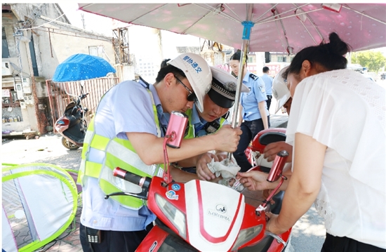 当天上午,陈文波带着3名协警查纠电瓶车违法行为,短短1个小时,查处了电瓶车非法加装遮阳伞和非法载人等违法行为20余起。对查处的非法加装遮阳伞的电瓶车,现场一律拆除,并向电瓶车驾驶员解释加装遮阳伞的危害。