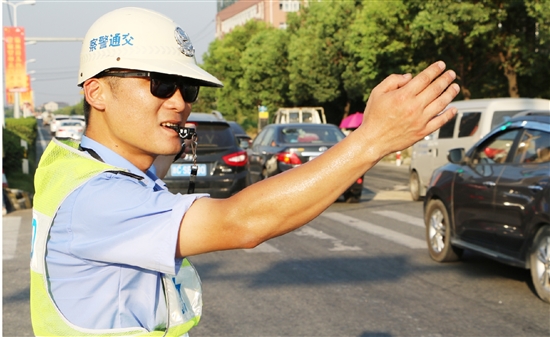 不远处的路口,协警郑建军正在烈日下指挥过往车辆,疏导交通,以免因交通事故引起交通堵塞。只见汗水顺着他的脸颊往下流淌,身上的警服已被汗水浸透,手臂被晒得黝黑。